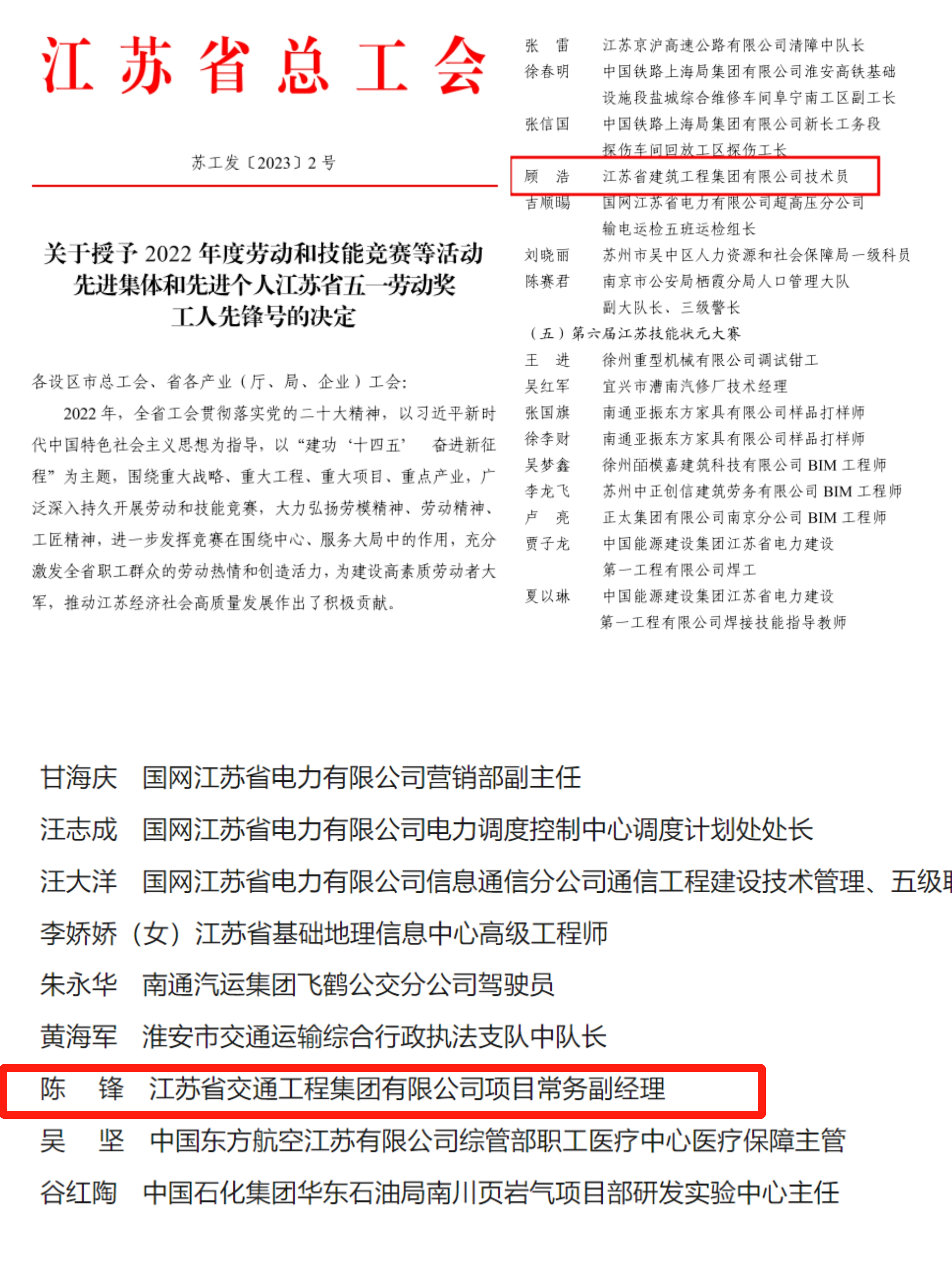 “五一”勞動節(jié)前夕,江蘇省總工會發(fā)布《關(guān)于表彰2023年省五一勞動獎和江蘇省工人先鋒號的決定》,集團(tuán)第一工程公司顧浩、江蘇交工陳鋒榜上有名,被授予“江蘇省五一勞動獎?wù)隆薄?/p>