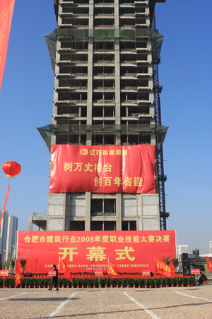 12月1日上午,江蘇省建集團(tuán)人行合肥支行項目現(xiàn)場艷陽高照,彩旗飄揚(yáng),由安徽省合肥市建委主辦、江蘇省建集團(tuán)承辦的合肥市建筑行業(yè)2008年度職業(yè)技能大賽決賽在合肥市濱湖新區(qū)江蘇省建集團(tuán)人行合肥支行項目工地拉開帷幕。來自合肥市肥東、肥西、長風(fēng)、市屬、安徽省屬及進(jìn)肥企業(yè)6支代表隊共百余名選手參加了決賽。江蘇省建集團(tuán)共有12名技術(shù)能手進(jìn)入決賽。